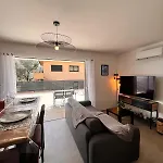 Diese Apartments mit Blick auf den Garten besteht aus einem Ankleidebereich, einer Sitzecke und der Küche mit einer Klimaanlage und der Waschmaschine. Das I Sognu - Charmant Appartement Neuf Proche Du Port verfügt über ein Badezimmer mit einem Haartrockner und Badelaken. Außerdem gibt es eine begehbare Dusche und eine getrennte Toilette usw.